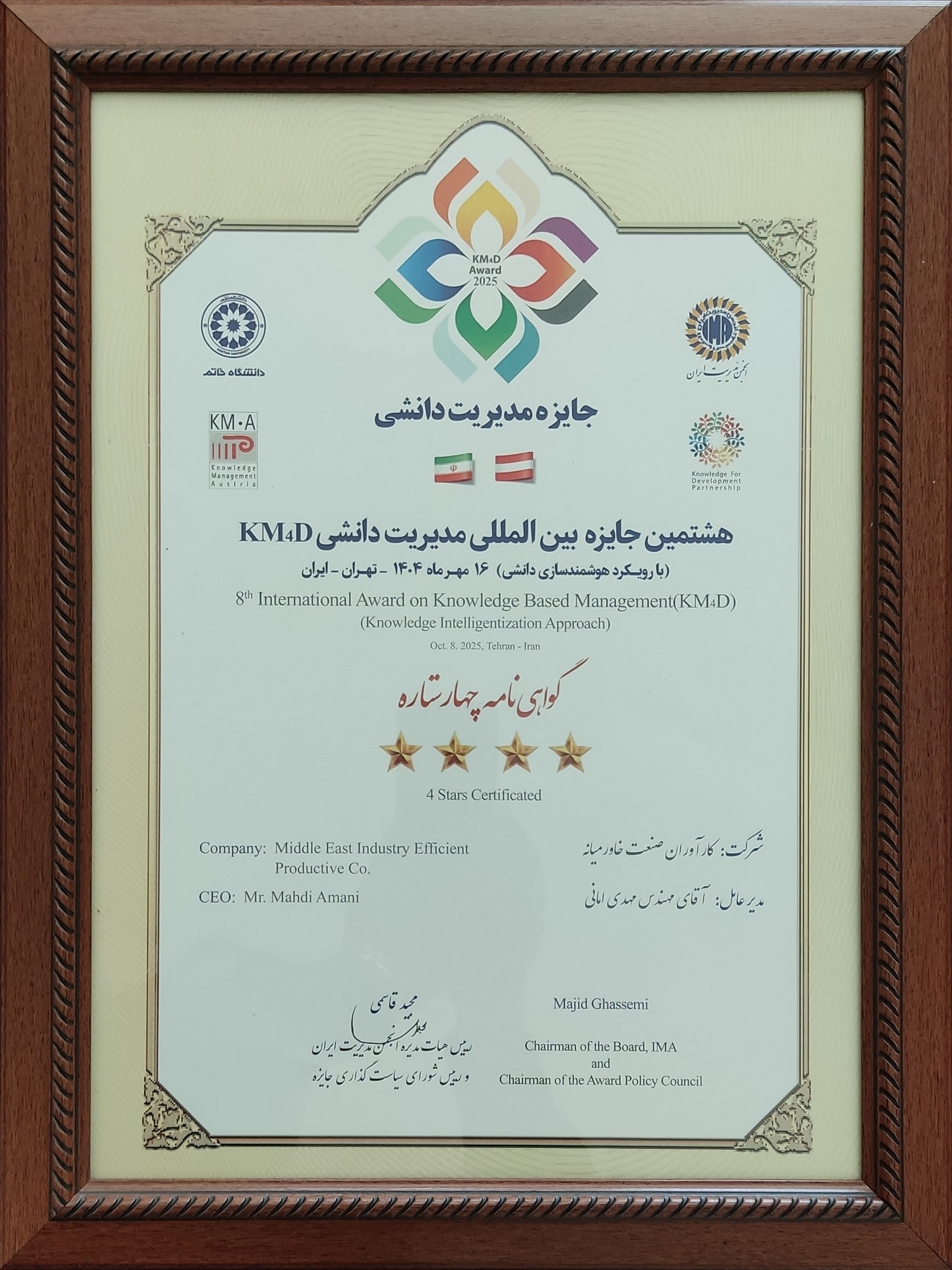 تقدیرنامه 4 ستاره مدیریت دانشی بر اساس مدل KM4D