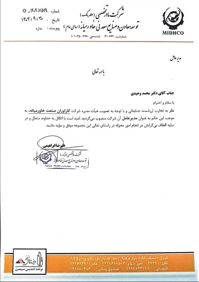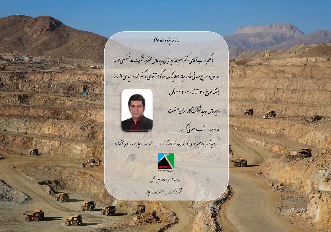 با سلام و احترام؛ به استحضار میرساند، با حکم جناب آقای دکتر علیرضا ابراهیمی مدیرعامل محترم شرکت مادرتخصصی توسعه معادن و صنایع معدنی خاورمیانه (هلدینگ میدکو)، آقای دکتر محمد وحیدی از روز یکشنبه مورخ 30 آذرماه 1404 بعنوان مدیرعامل جدید شرکت کاراوران صنعت خاورمیانه انتخاب و معرفی گردید. ضمن قدردانی از زحمات و تلاش های مدیرعامل اسبق سازمان جناب آقای مهندس مهدی امانی، آرزوی توفیق و سربلندی برای جناب اقای دکتر وحیدی در مسیر پیش رو را داشته و امیدواریم با بهره گیری از علم و توانمندی ایشان در حوزه مدیریت و همدلی و تلاش همکاران گرامی در بخش ها و فرایندهای مختلف شاهد کسب موفقیت های روزافزون خانواده بزرگ کاراوران صنعت خاورمیانه در تمامی عرصه ها باشیم. روابط عمومی و امور بین الملل شرکت کاراوران صنعت خاورمیانه